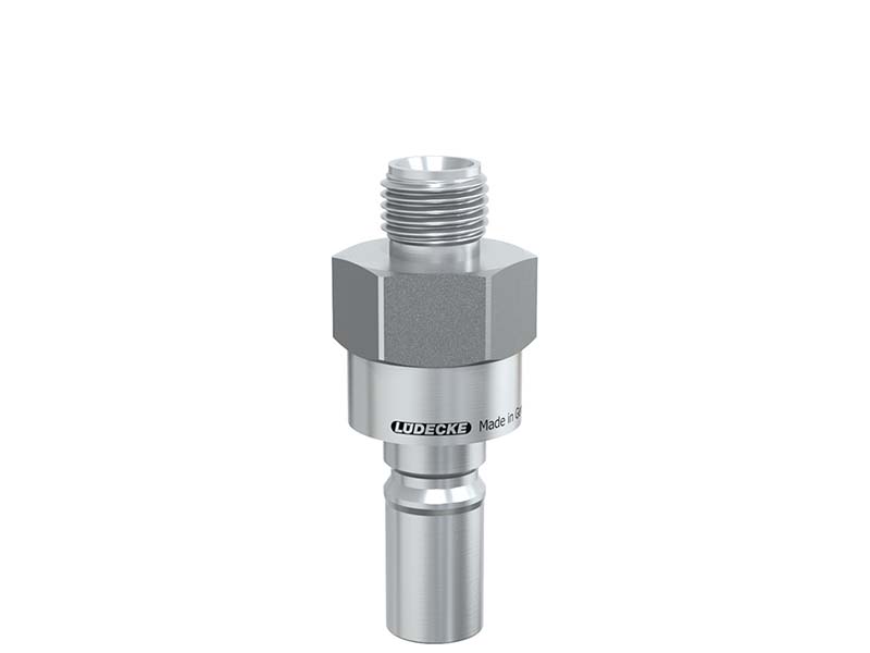 Wtyk szybkozłączki z gwintem zewnętrznym, wykonane ze stali szlachetnej i uszczelnieniem z gumy fluorowej (FKM).