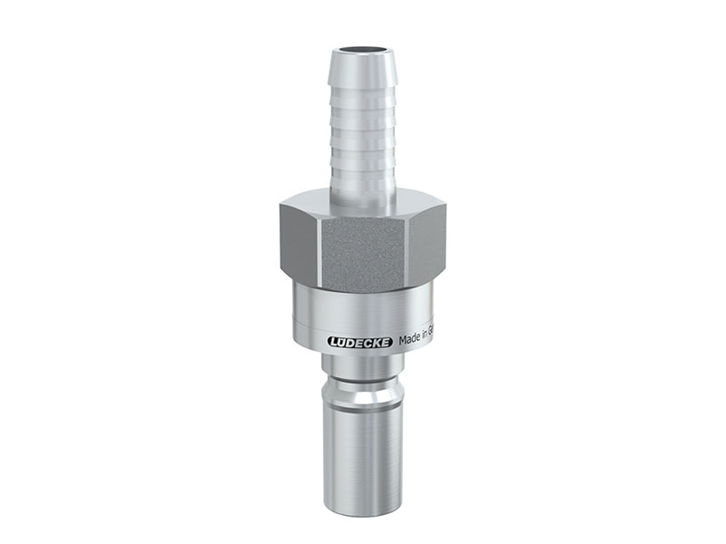 Wtyk szybkozłączki z króćcem do węża, wykonane ze stali szlachetnej i uszczelnieniem z gumy fluorowej (FKM).