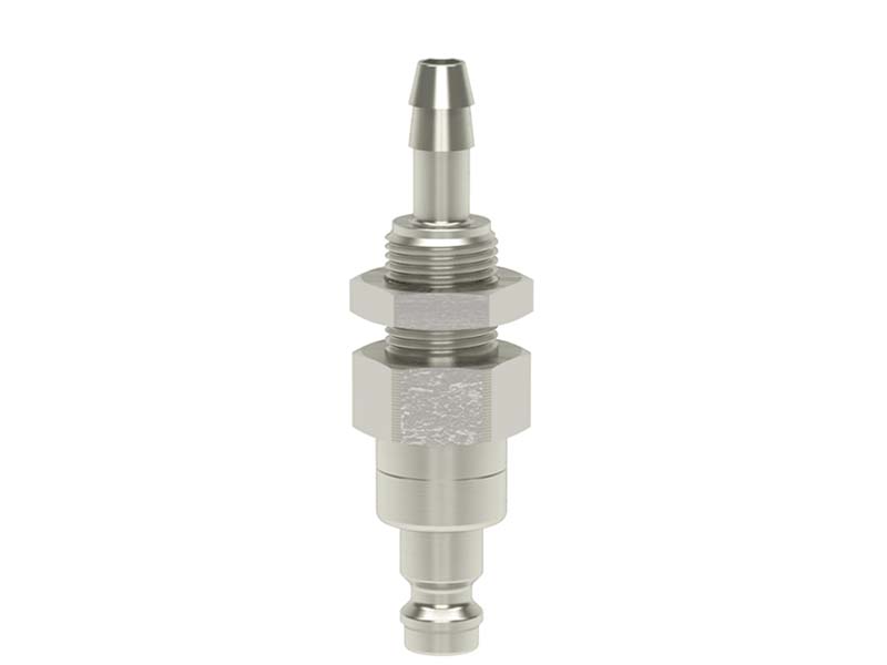 Wtyk szybkozłączki grodziowej, obustronnie odcinający z króćcem do węża i nakrętką zaciskową, wykonane z mosiądzu (MS 58) niklowanego, z elementami ze stali szlachetnej i uszczelnieniem z gumy nitrylowej (NBR).