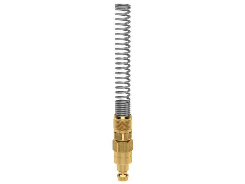 Wtyk szybkozłącza z króćcem do węża, nakrętką zaciskową i sprężyną ochronną na wąż, wykonany z mosiądzu (MS 58), z elementami ze stali szlachetnej i uszczelnieniem z gumy nitrylowej (NBR).
