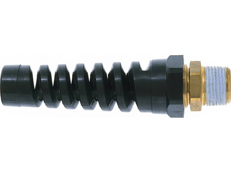 Końcówka sztywna z powleczonym gwintem zewnętrznym, wykonana z mosiądzu gładkiego MS 58, lub ze stali niklowanej, z Poliamidową lub ze Stali szlachetnej osłoną na wąż.