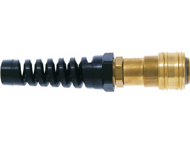 Gniazdo szybkozłączki DN 7,2 z Serii ES lub DN 5 z Serii ESM wykonane z mosiądzu gładkiego MS 58, z Poliamidową osłoną na wąż.