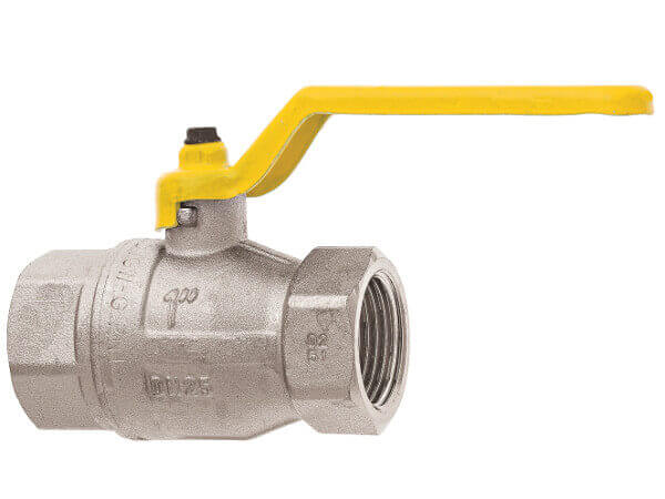 Zawór kulowy do gazu z gwintami wewnętrznymi z pełnym przepływem, z mosiądzu niklowanego, z uszczelkami z PTFE, FKM i NBR.