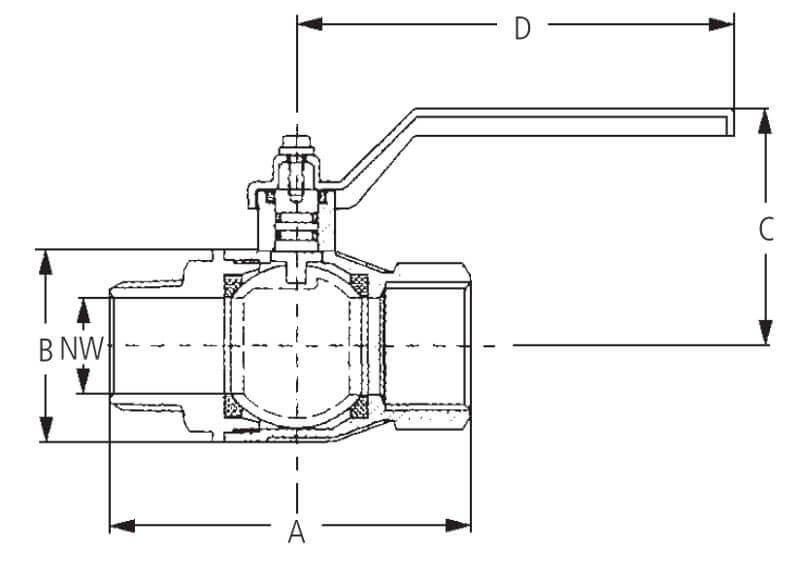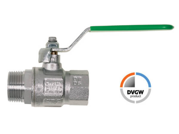 Zawór kulowy z gwintem zewnętrznym i wewnętrznym z pełnym przepływem do wody pitnej, z mosiądzu niklowanego, z elementami ze stali i uszczelkami z PTFE, FKM i NBR.