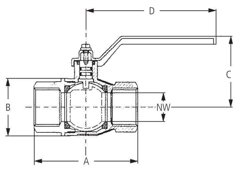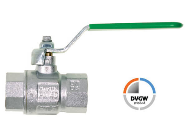 Zawór kulowy z gwintami wewnętrznymi z pełnym przepływem do wody pitnej, z mosiądzu niklowanego, z elementami ze stali i uszczelkami z PTFE, FKM i NBR.