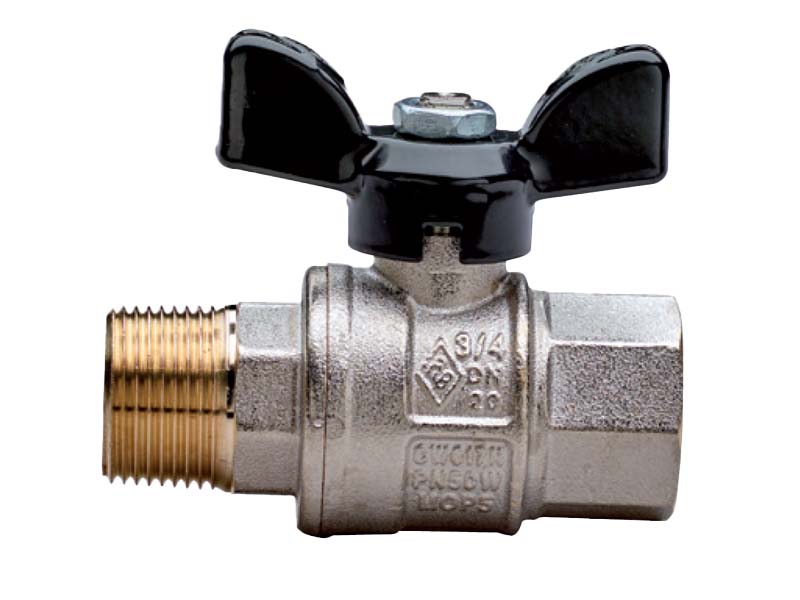 Kulowy zawór z gwintami wewnętrznym i zewnętrznym z mosiądzu, z uszczelnieniem z PTFE, NBR, z aluminiową rączką.