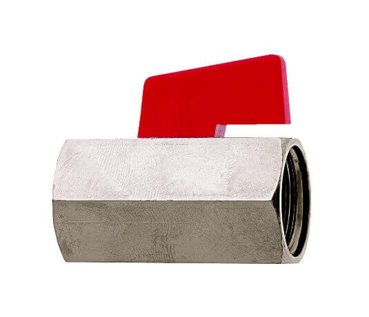 Zawór kulowy mini z pełnym przepływem, w którym korpus wykonany jest z mosiądzu chromowanego, z elementami z tworzyw sztucznych i uszczelkami z PTFE i NBR.