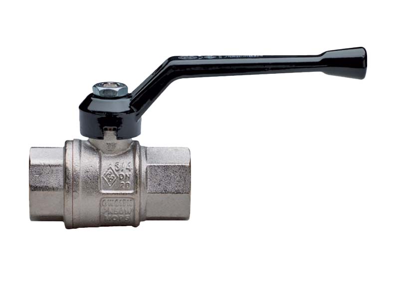 Kulowy zawór mufowy z gwintami wewnętrznymi z mosiądzu, z uszczelnieniem z PTFE, NBR, z aluminiową rączką.