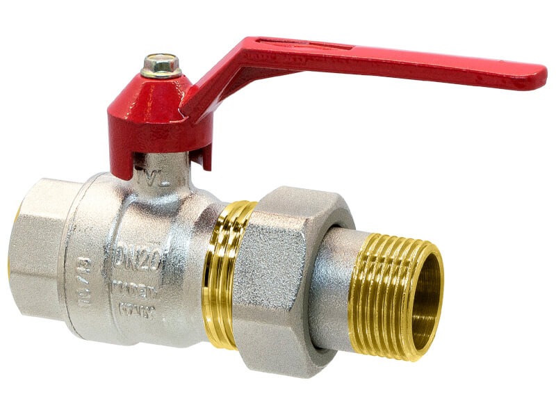 Kulowy zawór nyplowy z gwintami wewnętrznym i zewnętrznym, ze śrubunkiem, z mosiądzu, z uszczelnieniem z PTFE, FKM i NBR, z aluminiową rączką.
