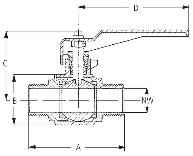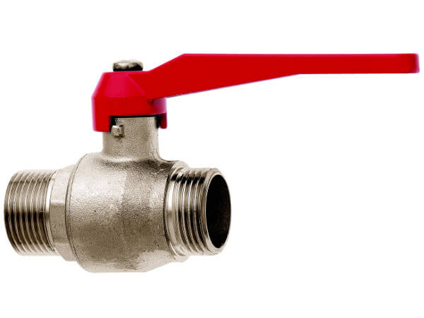 Zawór kulowy z gwintami zewnętrznymi z pełnym przepływem, typ 38, z mosiądzu niklowanego, z elementami z aluminium i uszczelkami z PTFE i NBR.