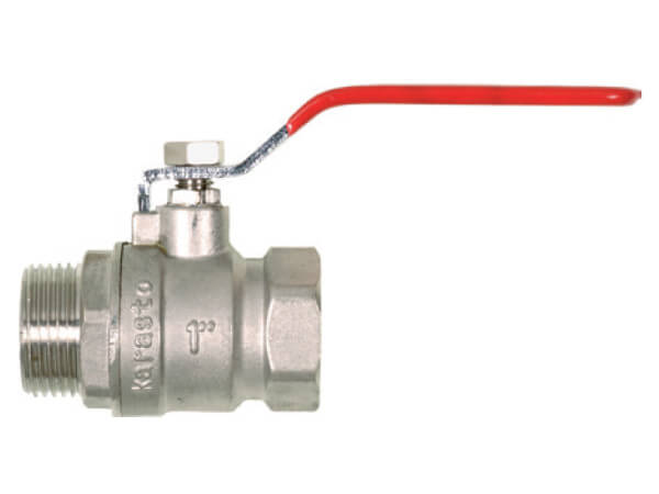 Zawór kulowy z gwintem zewnętrznym i wewnętrznym z pełnym przepływem GEKA® typ 7, z mosiądzu niklowanego, z elementami ze stali i uszczelkami z PTFE i NBR.