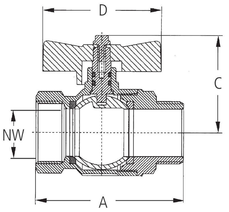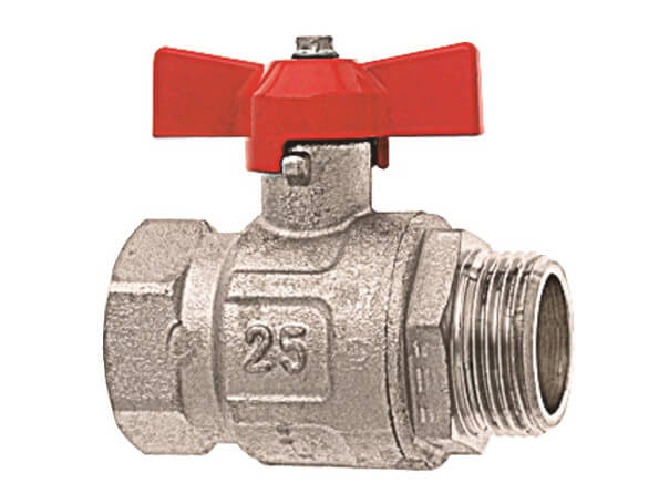 Zawór kulowy z gwintem zewnętrznym i wewnętrznym z pełnym przepływem, z mosiądzu niklowanego, z elementami z aluminium i uszczelkami z PTFE, FKM i NBR.