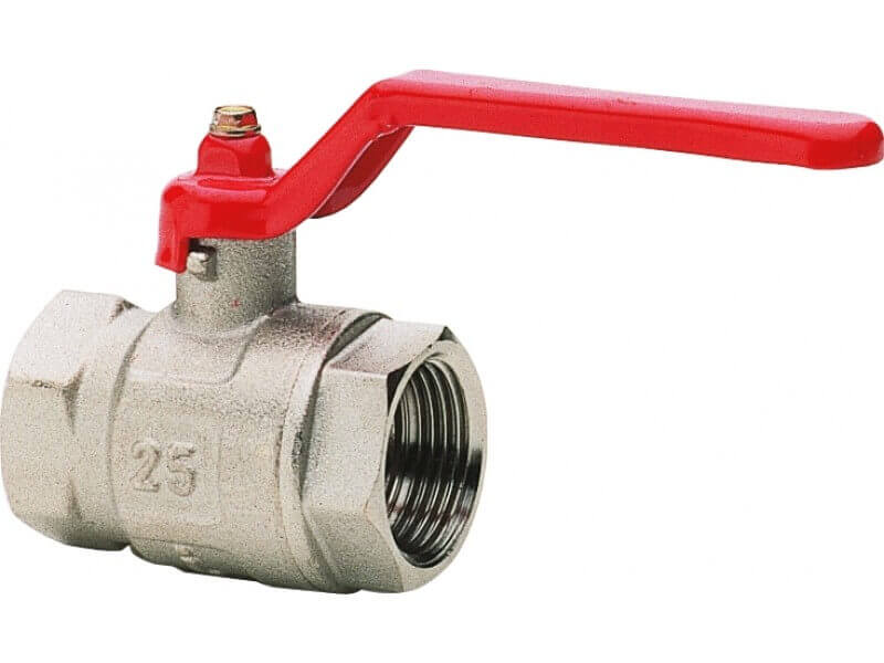 Zawór kulowy z pełnym przepływem, typ 9000, w którym korpus wykonany jest z mosiądzu chromowanego, natomiast uszczelka z PTFE.