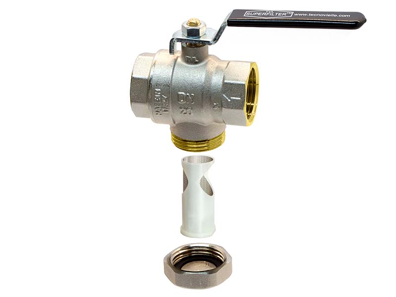 Zawór kulowy z wymiennym wbudowanym filtrem, wykonany z mosiądzu niklowanego, z elementami ze stali szlachetnej, stali ocynkowanej i uszczelnieniami z teflonu (PTFE), gumy olejoodpornej (NBR), gumy fluorowej (FKM).