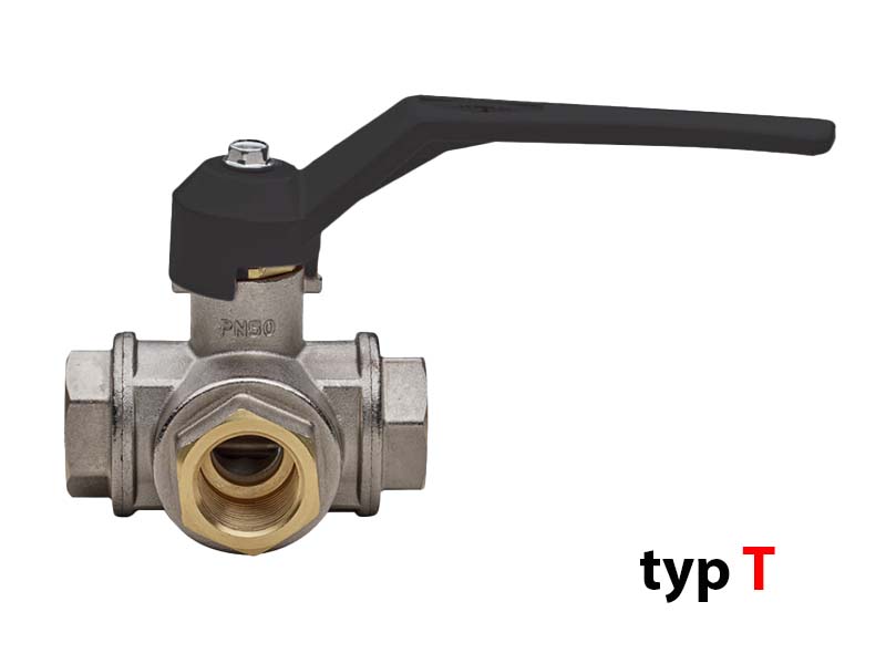 Kulowy zawór trójdrożny typ T z mosiądzu, z uszczelnieniem z PTFE i FKM.