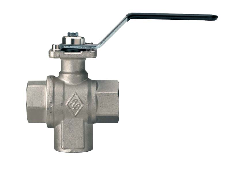 Kulowy zawór trójdrożny typ T z mosiądzu, z uszczelnieniem z PTFE i FKM, do sterowników siłowych.
