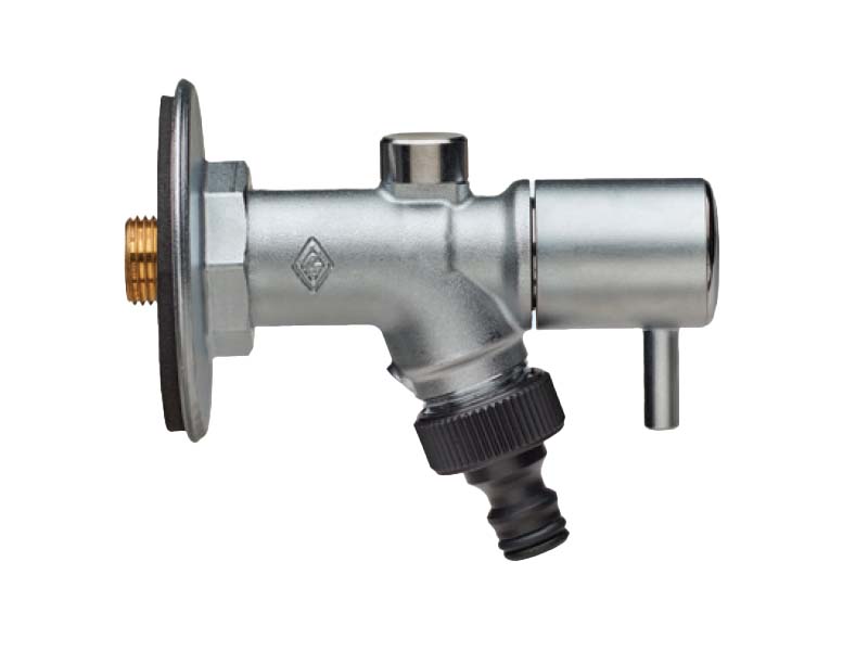 Zawór zewnętrzny z gwintem zewnętrznym i wtykiem szybkozłączki ogrodowej, wykonany z mosiądzu, z uszczelnieniem z NBR, z elematnami z tworzyw sztucznych.