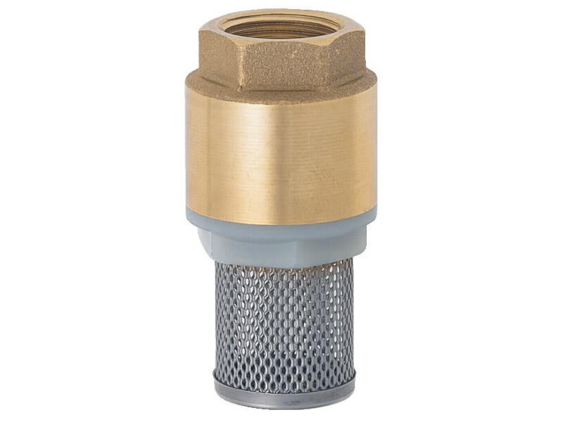 Zawór zwrotny z koszem ssawnym, wykonany z mosiądzu, z elementami ze stali nierdzewnej i tworzywa sztucznego, z uszczelką z NBR.