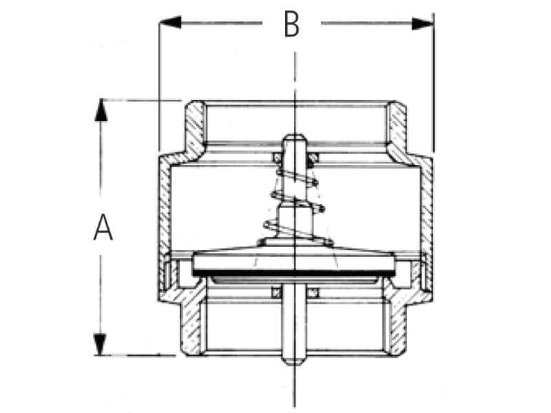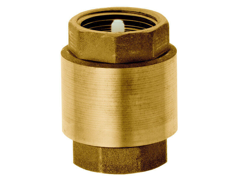 Zawór zwrotny z gwintami wewnętrznymi, wykonany z mosiądzu, z elementami ze stali nierdzewnej i tworzywa sztucznego, z uszczelką z NBR.