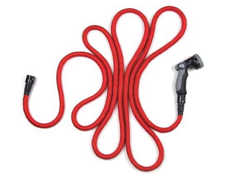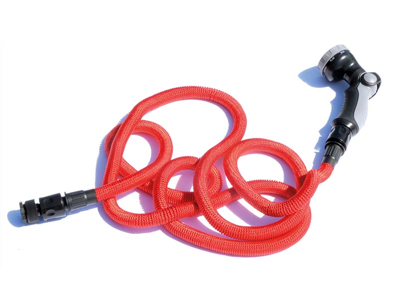 W skład zestawu wchodzi wąż rozciągliwy wykonany z włókien polipropylenowych (PP), szybkozłączki z gniazdami systemu "push-fit", wielofunkcyjny pistolet do nawadniania z wtykiem oraz adapter na kran z gwintem wew. 3/4" lub 1" wykonane z tworzyw sztucznych (PVC).