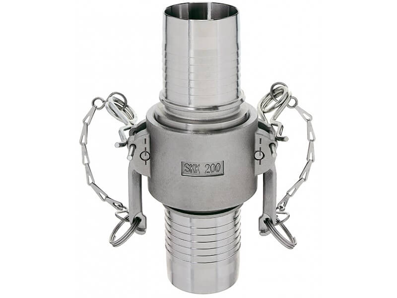 Złącze Kamlok żeńskie z króćcem do węża (różne typy), wykonane ze stali szlachetnej (AISI 316), z czarną uszczelką z NBR.