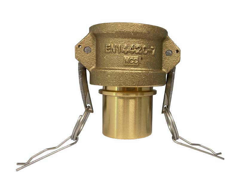 Złącze Kamlok żeńskie typ C z gładkim króćcem do węża pod obejmę skorupową, z mosiądzu, z uszczelką NBR.