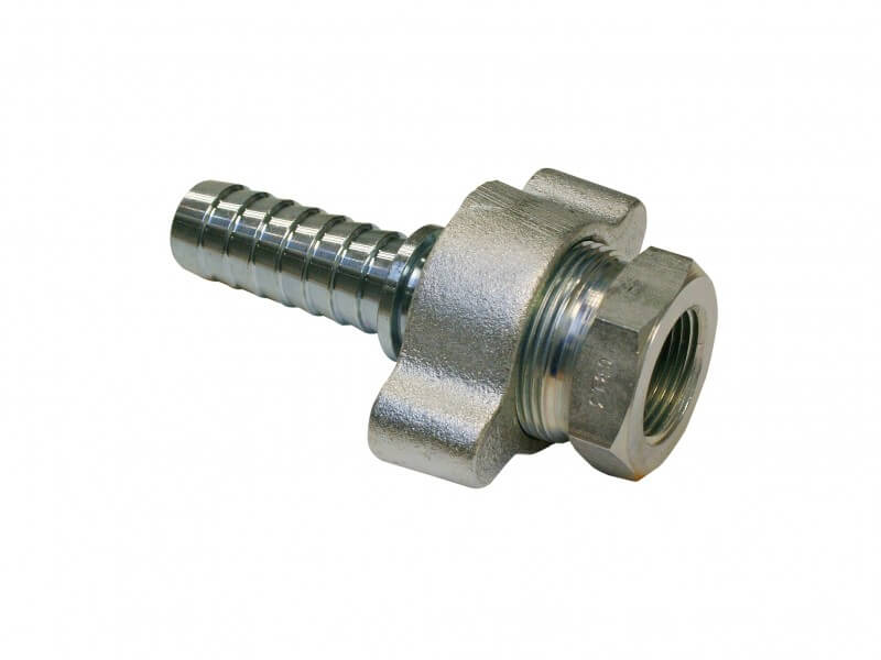 Złącze w systemie "BOSS" - część żeńska z nakrętką i adapterem, z króćcem do węża, wykonane ze stali lub żeliwa ocynkowanego galwanicznie.