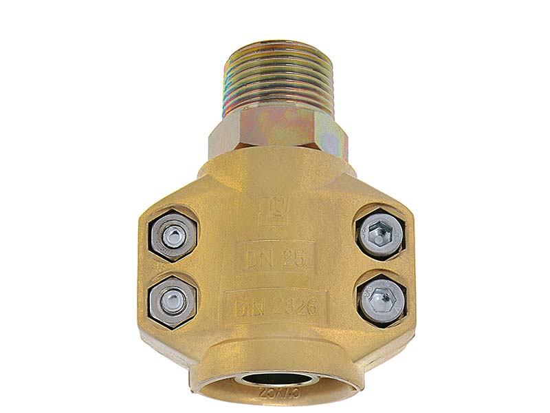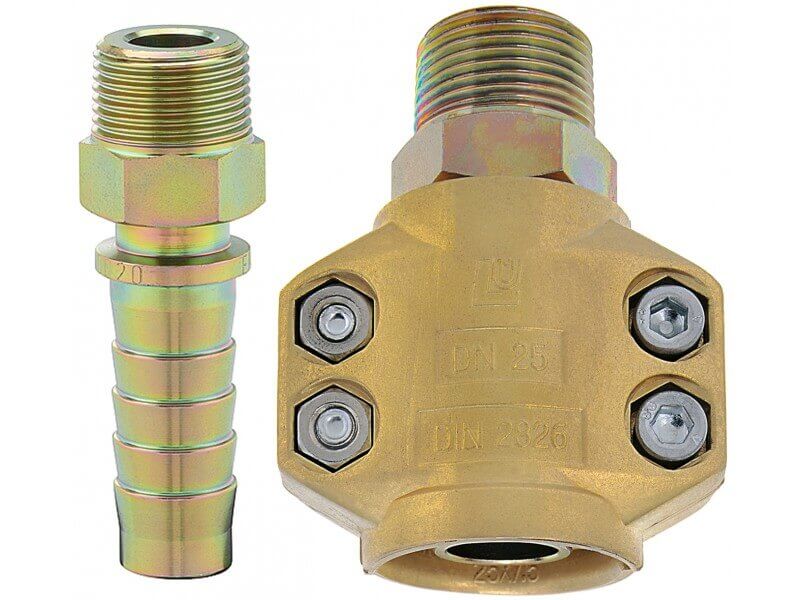 Kompletne złącze do pary z króćcem do węża i gwintem zewnętrznym wykonanym ze stali ocynkowanej pasywowanej chromem oraz obejmą skorupową z mosiądzu.