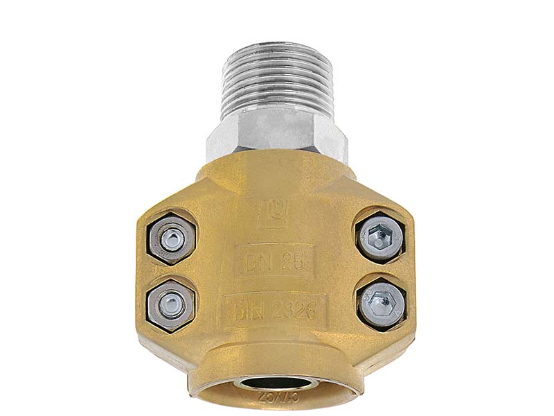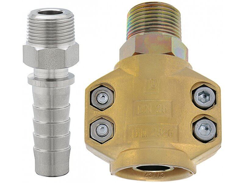 Kompletne złącze do pary z króćcem do węża i gwintem zewnętrznym wykonanym ze stali szlachetnej oraz obejmą skorupową z mosiądzu.