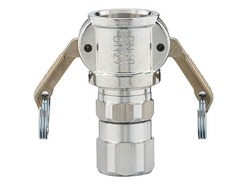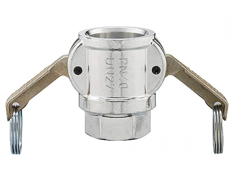 Złącze żeńskie do betonu z gwintem wewnętrznym z aluminium, z zapięciami z żeliwa ocynkowanego z żółtą pasywacją z uszczelkami z NBR, PTFE i PUR.