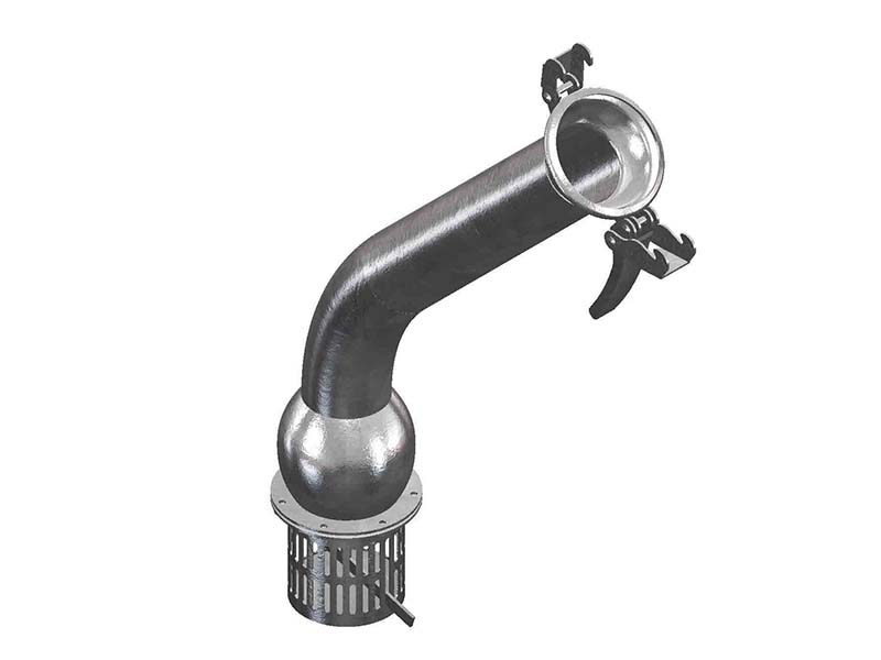 Element przeznaczony do montażu na instalacjach, urządzeniach i przewodach wyposażonych w złącza męskie FERRARI, które zanurzane są w zbiornikach, odstojnikach, cysternach czy szambach w celu pobrania płynnej zawartości. Zamontowany kosz przeciwdziała dostaniu się do instalacji większych elementów, jak gałęzie, kamienie czy inne elementy, które mogą uszkodzić elementy instalacji, takie jak np. pompa. Jednocześnie przewód wyposażony w taki kosz, jest odpowiednio dociążony, aby opaść na dno zbiornika z którego pobierana jest ciecz. Dodatkowym atutem elementu jest możliwość demontażu i wymiany kosza w razie uszkodzenia lub zużycia. Zawór zwrotny uniemożliwia cofanie się pobieranej substancji podczas przerw w pracy pompy. Wygięcie i długa rura zwiększa możliwości instalacyjne złącza, pozwalając na instalacje w miejscach niedostępnych dla złączy prostych.