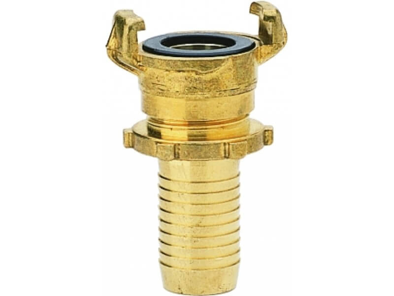 Złącze kłowe Geka skręcane z króćcem do węża zbudowane jest z mosiądzu, z czarną uszczelką z NBR.