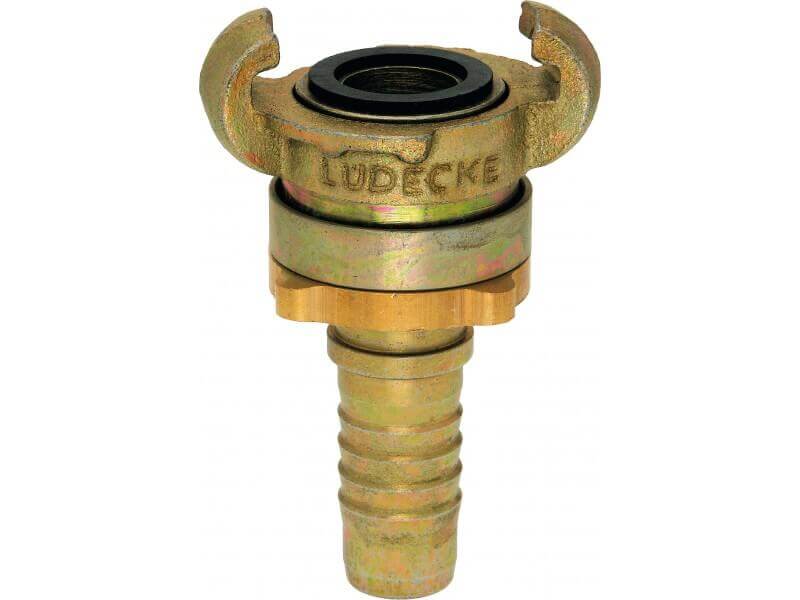 Złącze kłowe skręcane z króćcem do węża, wykonane z żeliwa ciągliwego, ocynkowanego, z elementami ze stali ocynkowanej i z mosiądzu z uszczelnieniem z Perbunanu (NBR).