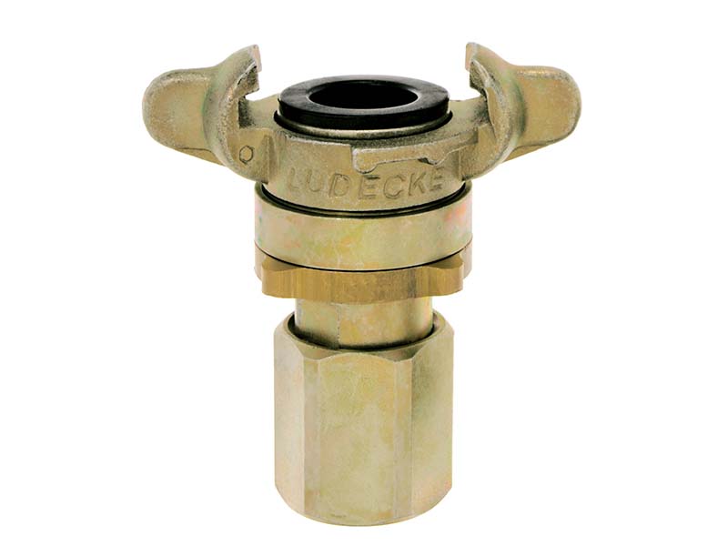 Skręcane w lewo złącza kłowe LUDECKE przeznaczone są do zastosowania przy zasilaniu sprężonymi gazami typu powietrze, para wodna, azot czy różne rodzaju gazu palnego, specjalistycznych urządzeń i instalacji. Złącza zazwyczaj są stosowane w przemyśle chemicznym, petrochemicznym, gdzie bardzo ważne jest, aby nie doszło do wadliwego połączenia przewodów, co może doprowadzić do wymieszania się ze sobą różnych rodzajów mediów. Takie wymieszanie mediów może spowodować eksplozję, uszkodzenie instalacji, specjalistycznych urządzeń czy też narazić na utratę zdrowia operatorów . Ich zaletą, jest użyty materiał, który dzięki oryginalnej i opatentowanej technologii wytwarzania, charakteryzuje się większą wytrzymałością na rozciąganie, zginanie i naprężenia produktu, w stosunku do złączy wytwarzanych na Dalekim Wschodzie. Dzięki temu, złącza te charakteryzują się dużo większą żywotnością, co przekłada się na dużo mniejsze ryzyko uszkodzenia drogich urządzeń specjalistycznych, czy też narażenie zdrowia operatorów. Żółta pasywacja chromem, pozbawiona jest szkodliwego dla środowiska i zdrowia chromu sześciowartościowego. Dzięki zastosowaniu specjalnej konstrukcji, złącza posiadają skręcany pierścień bezpieczeństwa, który ułatwia montaż, oraz zabezpiecza połączenie przed przypadkowym wypięciem, np. w skutek wibracji obsługiwanego urządzenia. Zastosowanie króćców z pierścieniem bezpieczeństwa, zapobiega ześlizgiwaniu się węża i obejmy w trakcie pracy przewodu. Zapewnia to ochronę przed uszkodzeniem zarówno przewodów, jak i urządzeń, które mogą nagle utracić zasilanie medium.