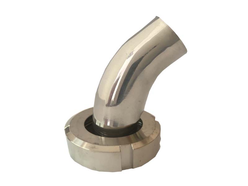 Kątowe złącze mleczarskie, skręcane, typ DIN 11851 żeńskie z nakrętką, z rurą do wspawania, wykonane ze Stali Szlachetnej bez uszczelki.