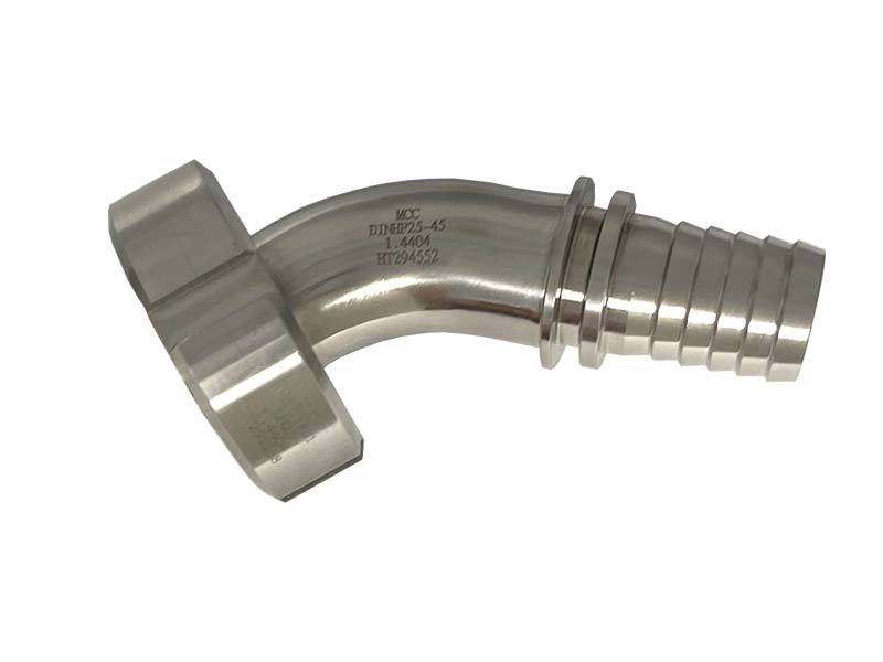Kątowe złącze mleczarskie, skręcane, typ DIN 11851 żeńskie z karbowanym króćcem, wykonane ze Stali Szlachetnej bez uszczelki.