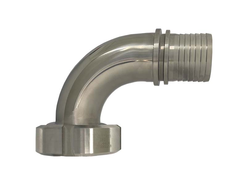 Kolano 90° ze złączem mleczarskim, skręcanym, typ DIN 11851 żeńskie z karbowanym króćcem oraz nakrętką, wykonane ze Stali Szlachetnej.