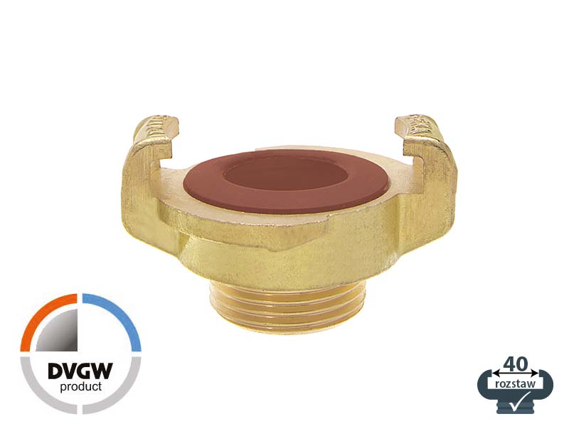 Złącze kłowe typu GEKA z gwintem zewnętrznym wykonane z mosiądzu i uszczelnieniem z EPDM.