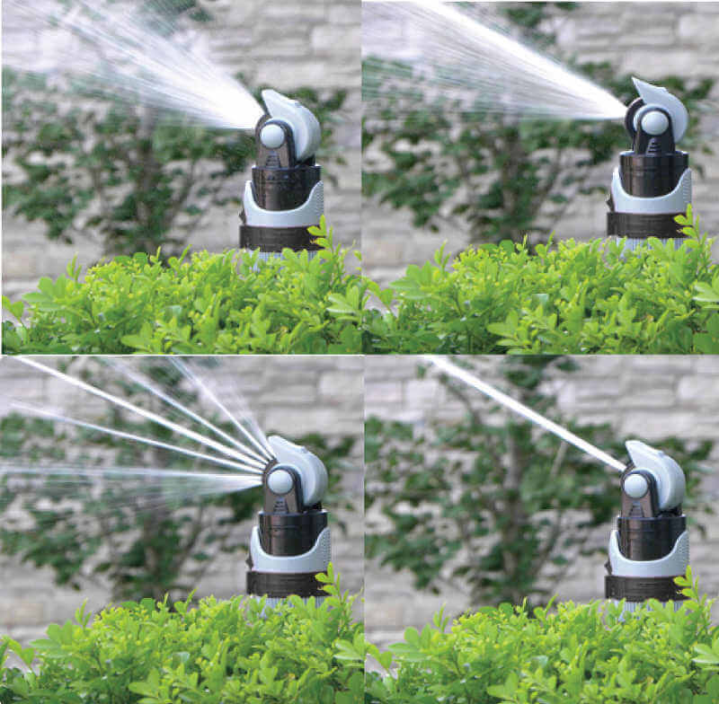 Zraszacz posiada funkcje regulacji nawadnianego obszaru i pracuje z ciśnieniem wody bieżącej z sieci (czyli ok 2-4 bar).