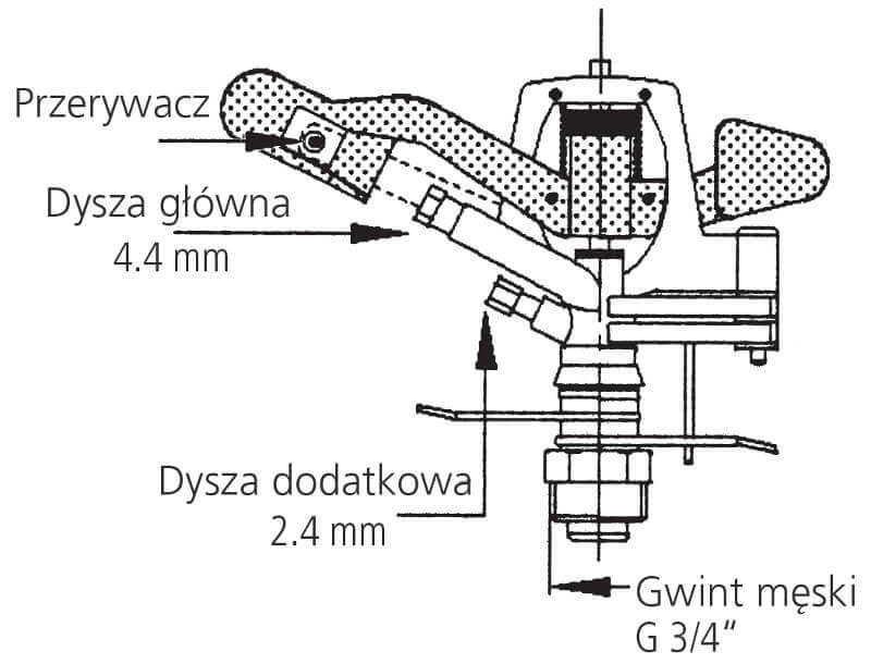 | Zalety | Możliwość regulacji zasięgu i siły zraszania. Możliwość ustawienia kąta zraszania od 20° do 360°. |