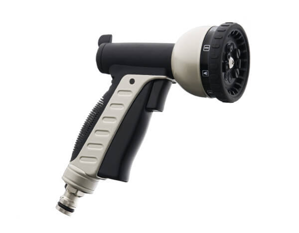 Poręczny zraszacz pistoletowy z możliwością regulacji siły, rodzaju i kształt strumienia zraszającego. Regulacja sposobu zraszania dostępna jest przez obrót głowicy zraszającej, która dodatkowo pokryta jest nieślizgającą się gumową powłoką. Powłoka ta zabezpiecza głowicę urządzenia przed uszkodzeniami mechanicznymi. Na głowicy umieszczono piktogramy symbolizujące rodzaj zraszania, dzięki czemu przekręcając ją, łatwo można dostosować i znaleźć pożądany kształt strumienia zraszającego. Dzięki temu mamy możliwość utworzenia zarówno szerokiego strumienia, delikatnej mgiełki płaskiego silnego strumienia, czy pojedynczego wąskiego strumienia punktowego. |