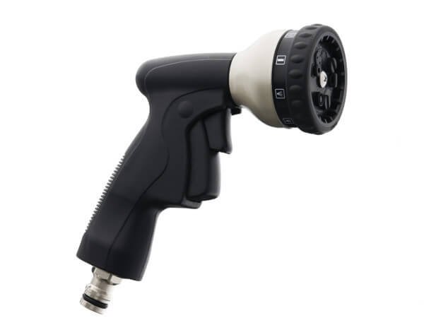 | Uwagi | Zraszacz ogrodowy z dziewięcioma możliwymi strumieniami. Metalowy korpus gwarantuje długi czas pracy, w szczególności dzięki złączu z mosiądzu pokrytego chromem. Ergonomiczna rączka z blokadą pracy ciągłej. Regulacja przepływu przez wciśnięcie spustu. Kompatybilny z innymi elementami push-fit. |
