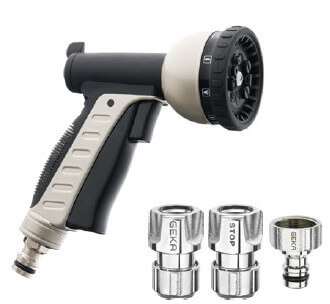 Wielofunkcyjny zraszacz pistoletowy 10S wyposażony we wtyk systemu GEKA® Plus "push-fit" przeznaczony do montażu na wężu ogrodowym, wyposażonym w gniazdo szybkozłączki w tym samym systemie. Wtyk zgodny z profilem wtyku popularnych szybkozłączek ogrodowych kompatybilnych z produktami np. "GARDENA". Element przeznaczony jest do nawadniania w ogrodnictwie, utrzymaniu zieleni, w przydomowych ogródkach czy na działkach rekreacyjnych oraz w przydomowych warsztatach i garażach do utrzymania czystości. Doskonale sprawdzi się również w zastosowaniach przemysłowych i profesjonalnych, ze względu na swoją solidną i trwałą budowę, przystosowaną do dużych obciążeń pracą. Charakteryzuje się bardzo prostą i niezawodną budową. Wtyk kompatybilny ze starszymi wersjami produktu GEKA® Ideal.