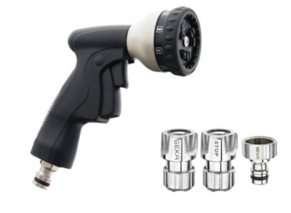 Wielofunkcyjny zraszacz pistoletowy 10S wyposażony we wtyk systemu GEKA® Plus "push-fit" przeznaczony do montażu na wężu ogrodowym, wyposażonym w gniazdo szybkozłączki w tym samym systemie. Wtyk zgodny z profilem wtyku popularnych szybkozłączek ogrodowych kompatybilnych z produktami np. "GARDENA". Element przeznaczony jest do nawadniania w ogrodnictwie, utrzymaniu zieleni, w przydomowych ogródkach czy na działkach rekreacyjnych oraz w przydomowych warsztatach i garażach do utrzymania czystości. Doskonale sprawdzi się również w zastosowaniach przemysłowych i profesjonalnych, ze względu na swoją solidną i trwałą budowę, przystosowaną do dużych obciążeń pracą. Charakteryzuje się bardzo prostą i niezawodną budową. Wtyk kompatybilny ze starszymi wersjami produktu GEKA® Ideal.