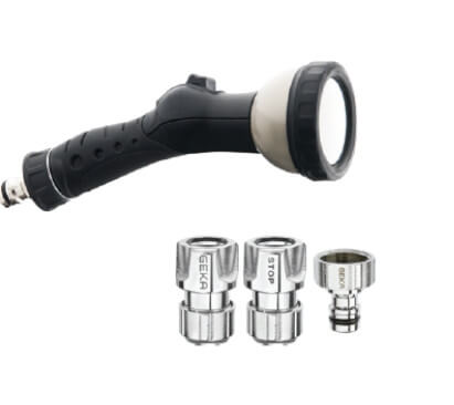 Zestaw zraszający do nawadniania z systemem szybkozłączek GEKA® Plus "push-fit", wykonanych z mosiądzu chromowanego i aluminium, z elementami gumowymi i z tworzyw sztucznych.